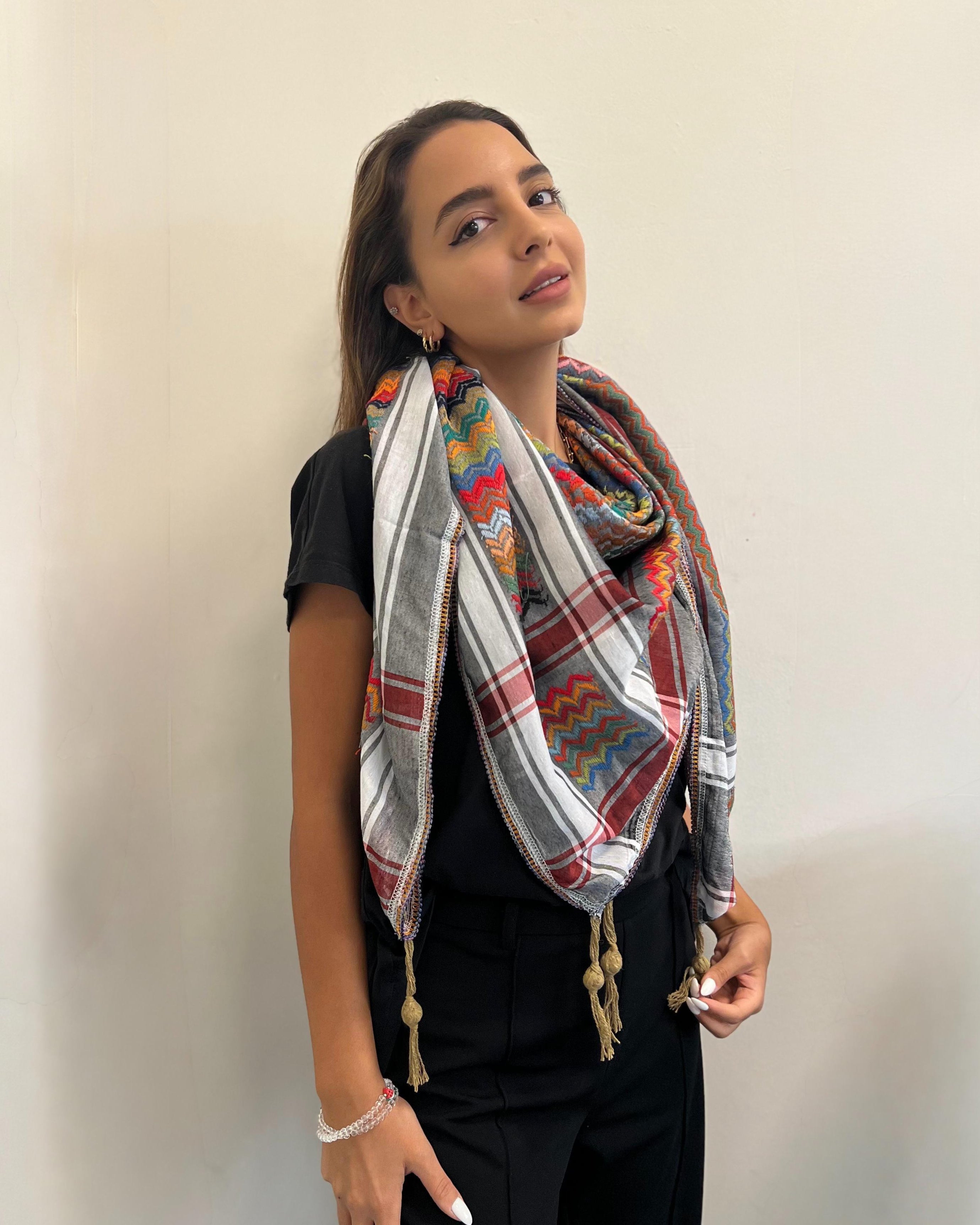 A bold contemporary reimagining of the traditional Palestinian kufiya. Crafted in Jordan...