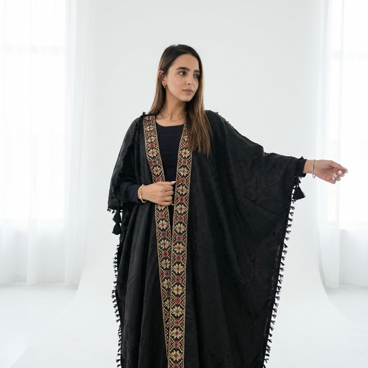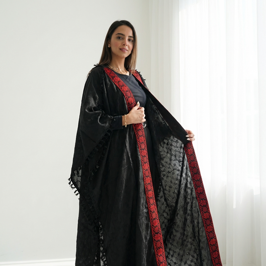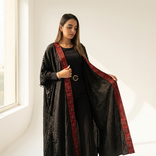 Palestinian Tatreez Bisht | Black and Red Embroidered Heritage Abaya (Free Size)