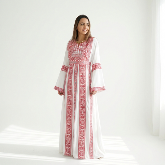 Palestinian Thobe Traditional Dress | White with Red Tatreez Embroidery for Adults