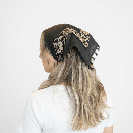 All Black Kufiya Bandana - Beige Tatreez