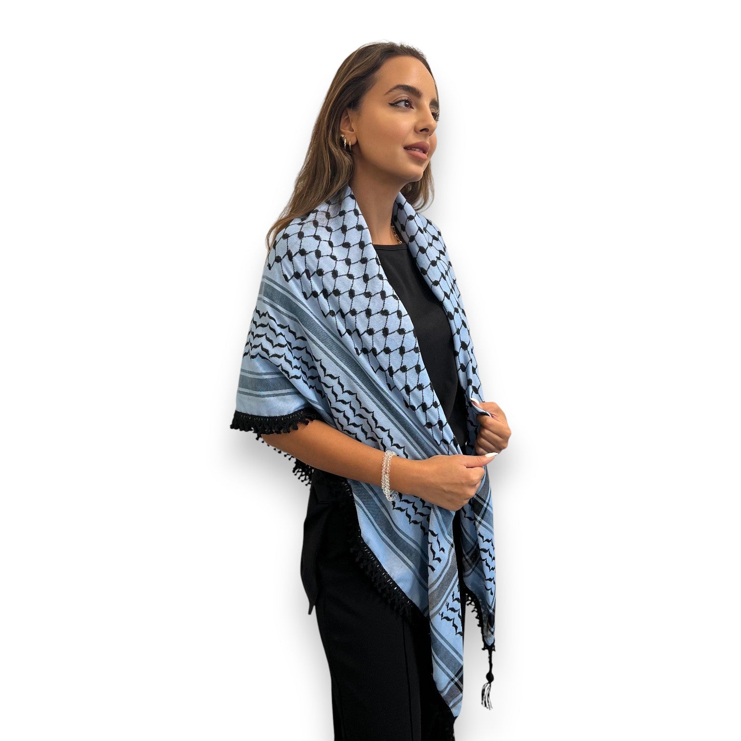 With a calm yet striking tone, the Echoes – Blue Mirage Kufiya (Keffiyeh) layers soft sky-inspired blue with deeper threads and black tassels. The result is a contemporary monotone piece that speaks both of heritage and of modern fashion.