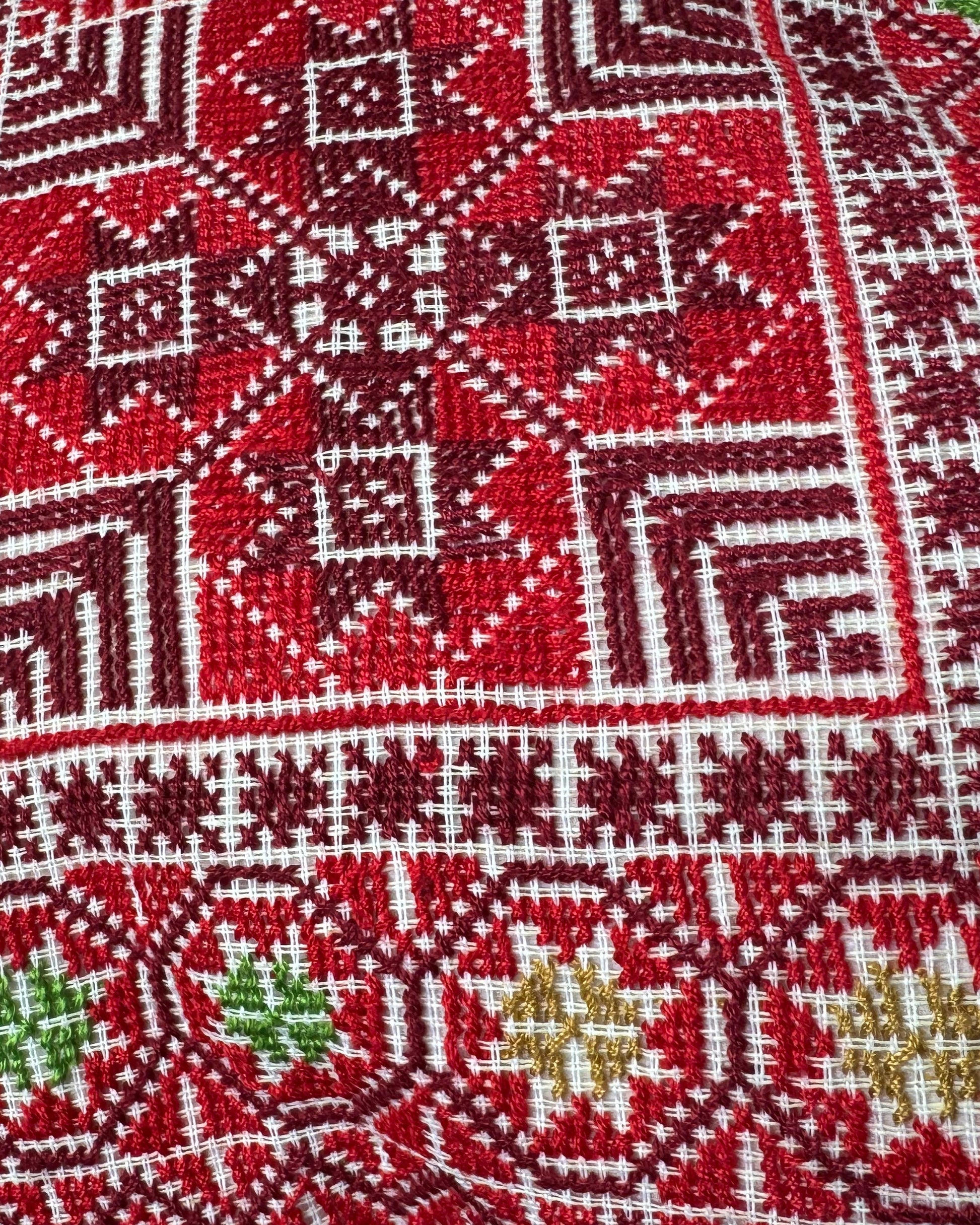 - Size: 16 x 16 in (40 x 40 cm) - Material: Cotton embroidery thread, polyester backing - Enclosure: Hidden zipper for secure fit - Insert not included - Handmade & handstitched in Jordan by Palestinian artisans - One-of-a-kind design