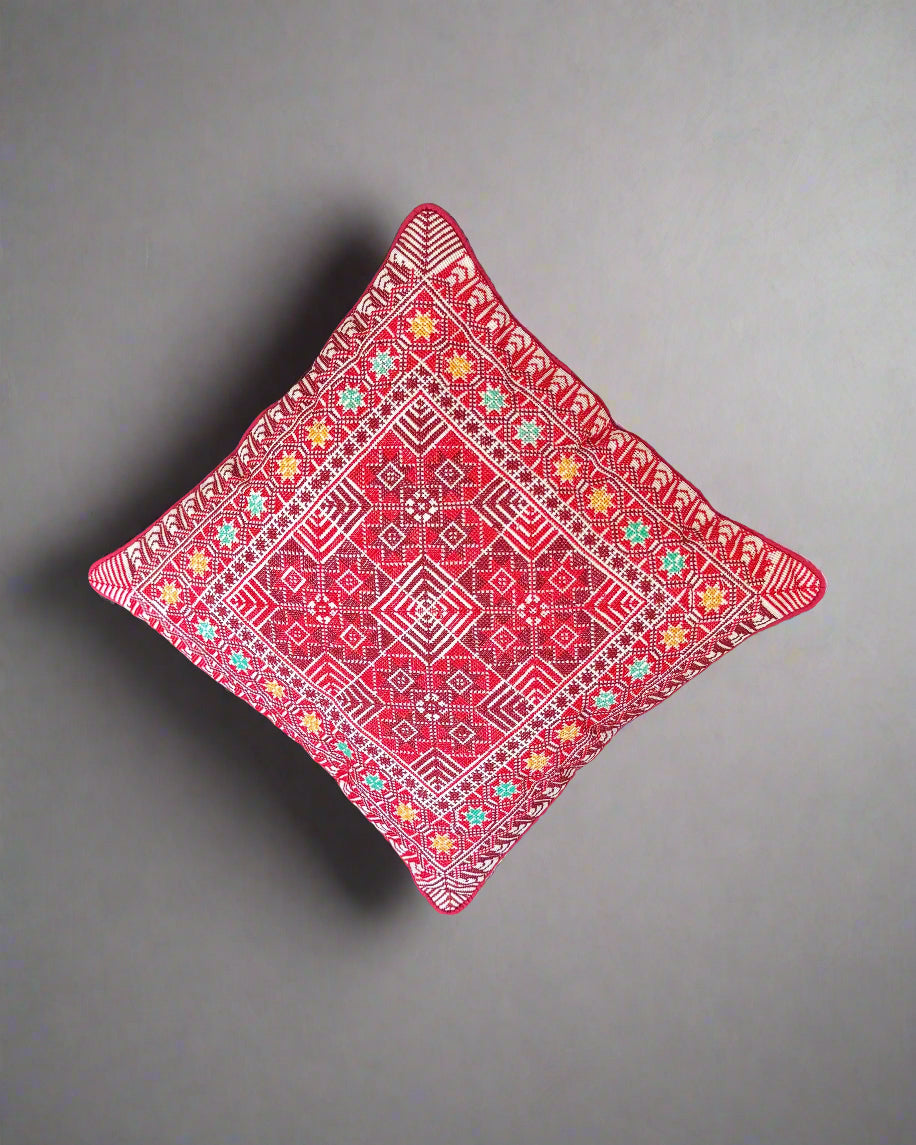 A striking blend of tradition and color, this handmade tatreez cushion cover features a bold red base highlighted by delicate teal and yellow embroidered stars. Every stitch is placed by hand, crafted by a Palestinian family in Jordan, carrying forward generations of cultural artistry.