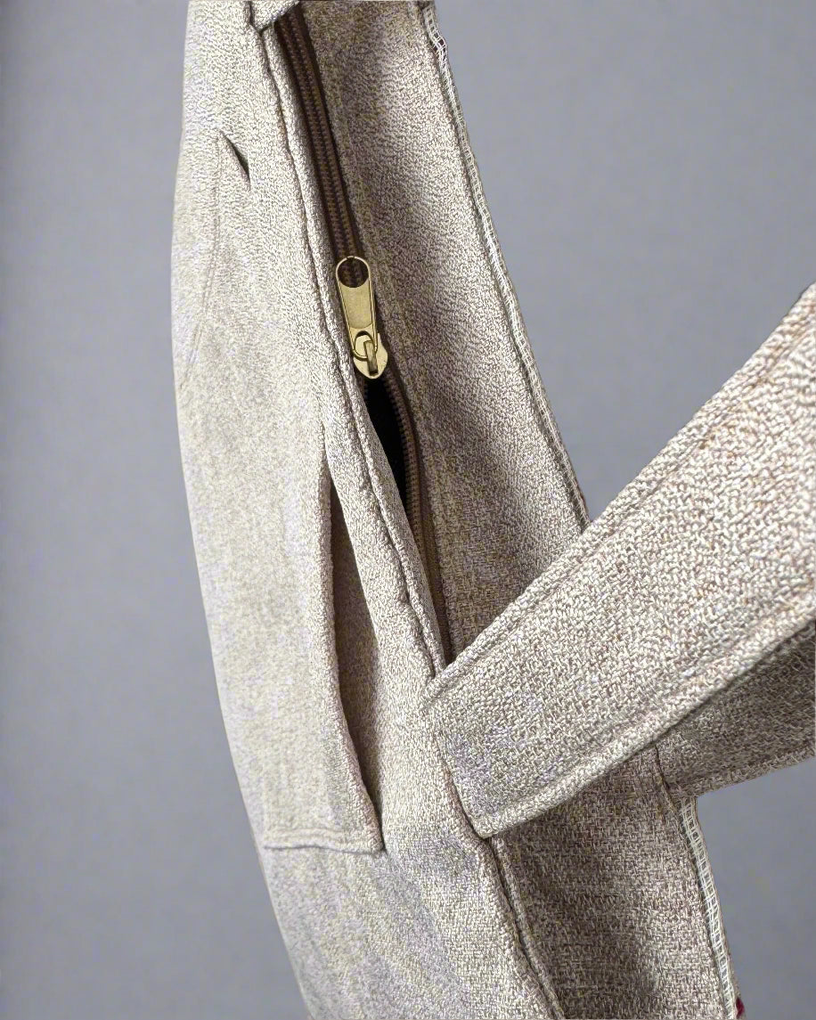 A practical tote with a heritage soul, this handmade tatreez bag features four delicate floral motifs at its center. The red embroidery tells a story of resilience and beauty, balanced against a beige back with zipper and pocket for everyday convenience.