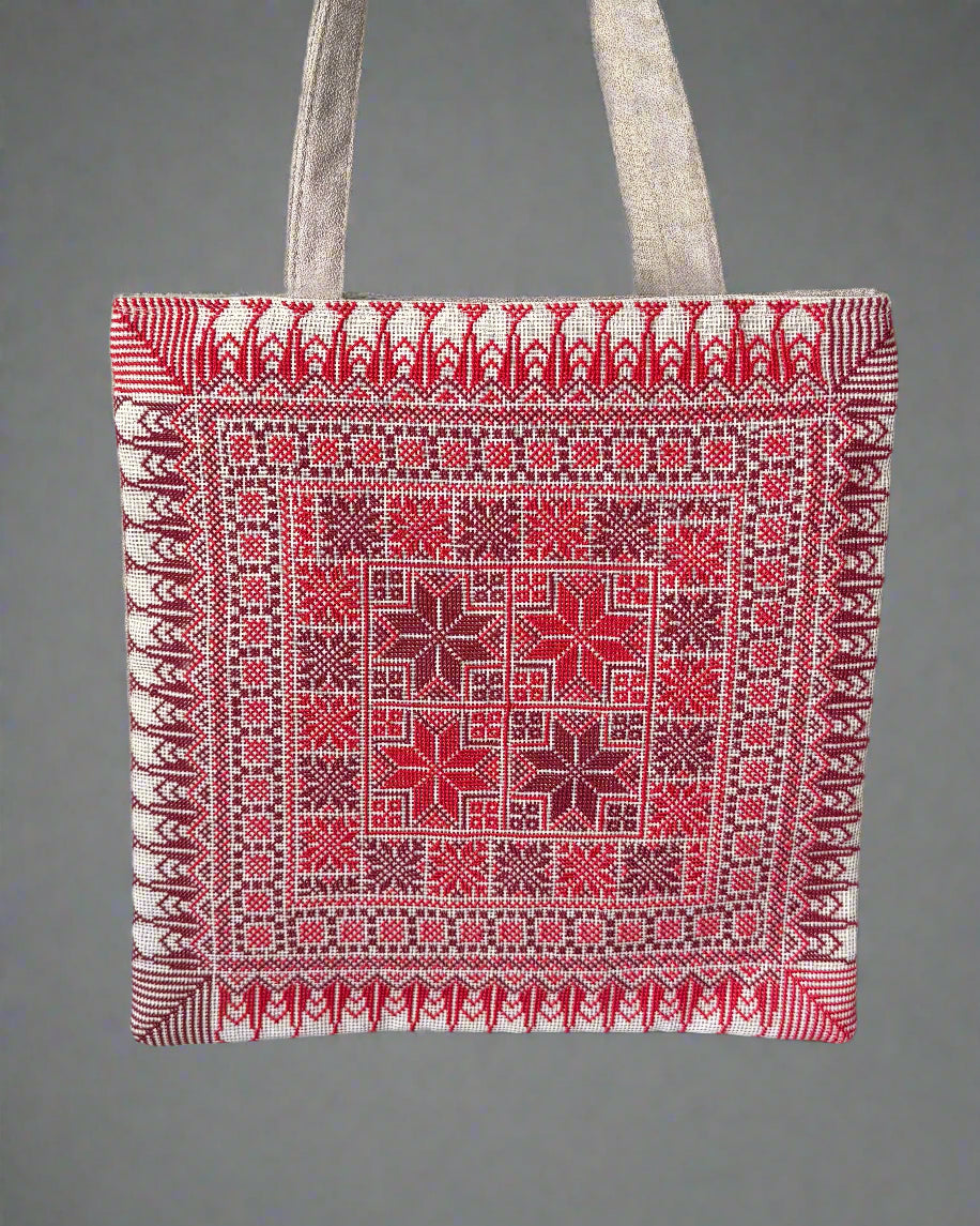 Handstitched in Jordan by a Palestinian family, this tote is not just a bag but a piece of living tradition — carrying both your essentials and the story of resilience woven into every stitch.