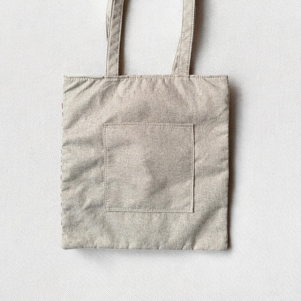 The red embroidery tells a story of resilience and beauty, balanced against a beige back with zipper and pocket for everyday convenience.