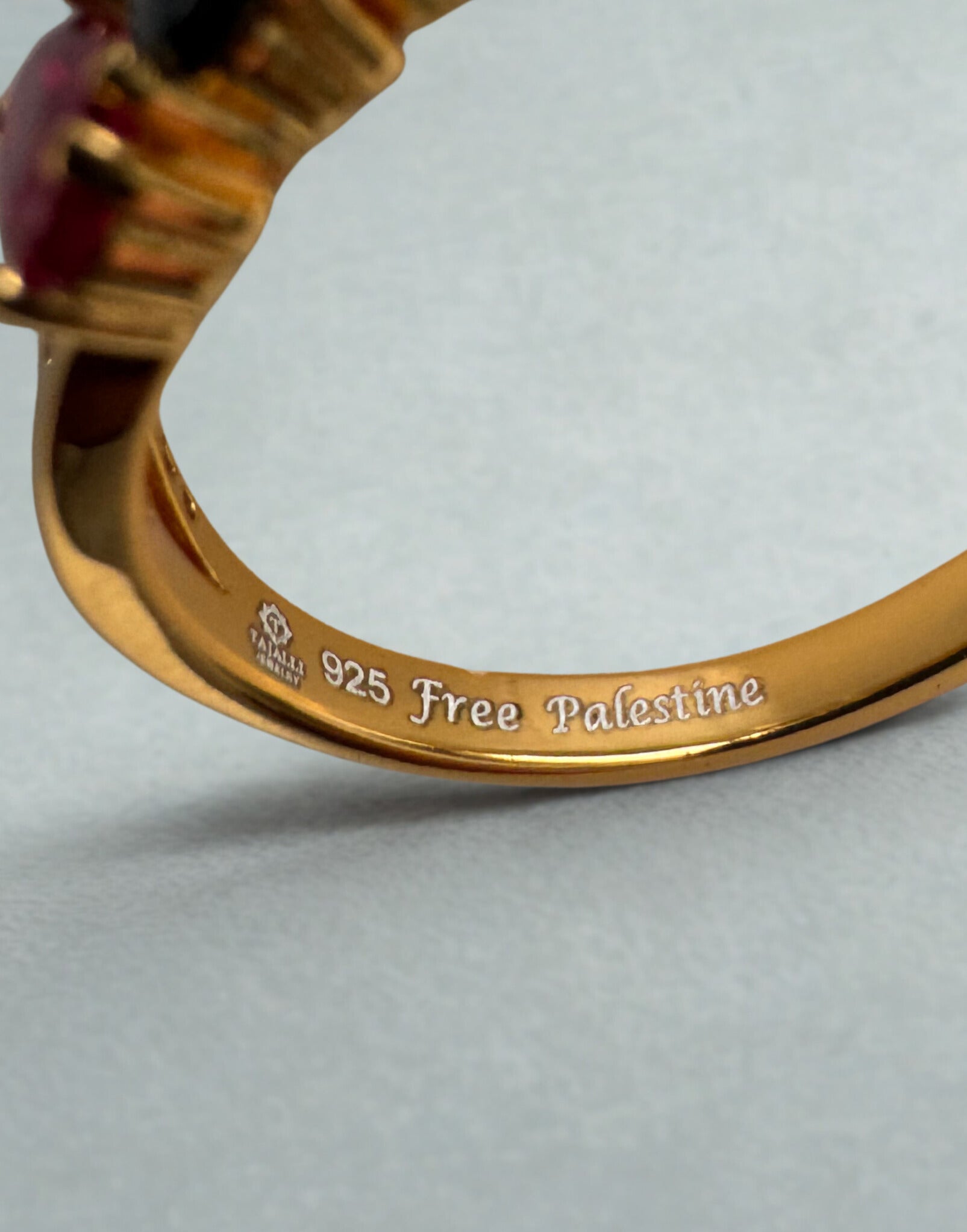 Each stone is set in a delicate band accented with cubic zirconia details, while the inside is engraved with βFree Palestineβ as a constant reminder of strength, solidarity, and belonging.