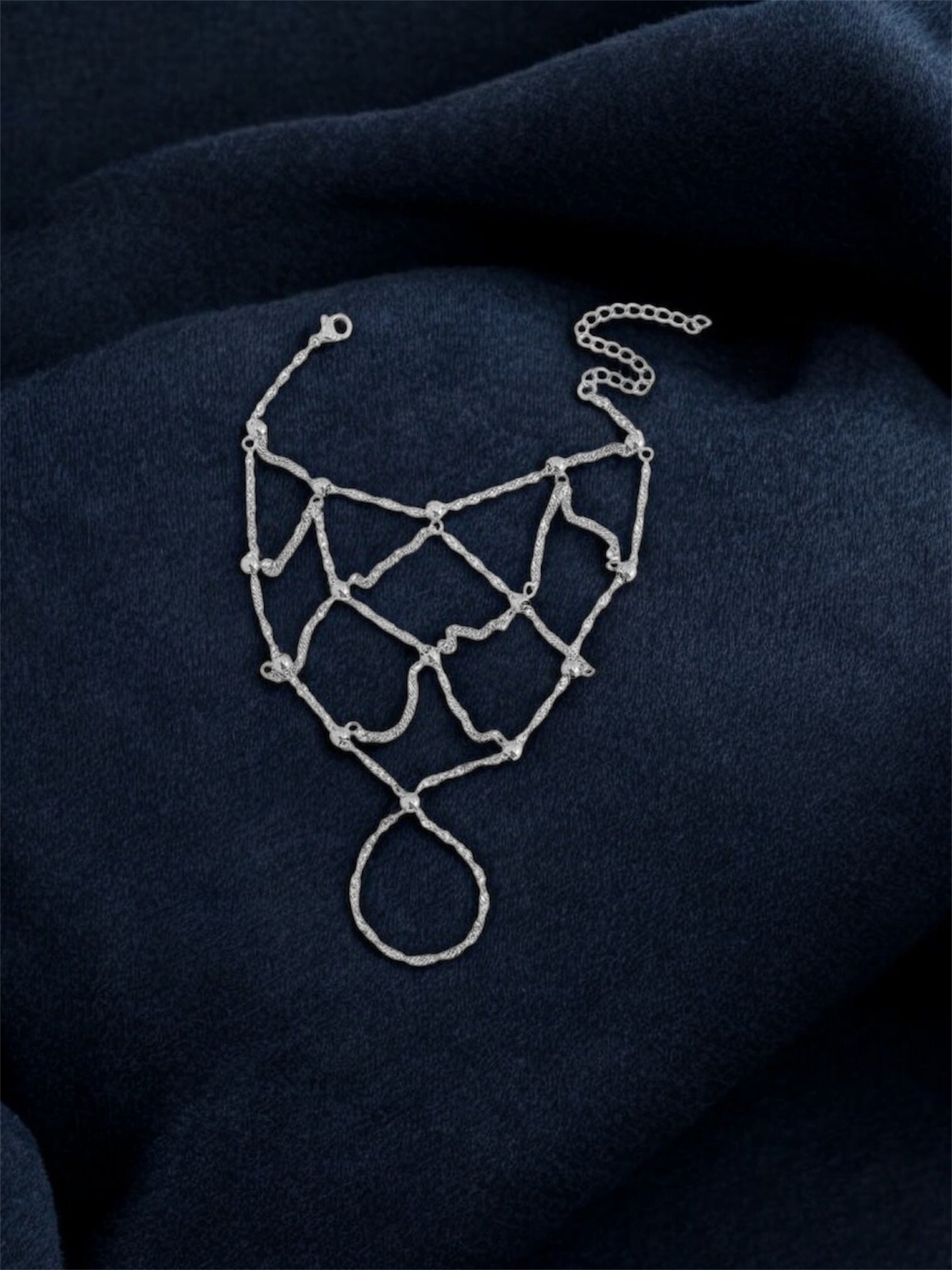 Inspired by the fishnet weave of the Palestinian keffiyeh, this hand chain adorns the hand with elegance and defiance. Available in gold or silver tones, the interlinked pattern wraps around the wrist and connects to a single ring that slips over the finger — forming a symbolic net of protection, connection, and identity.