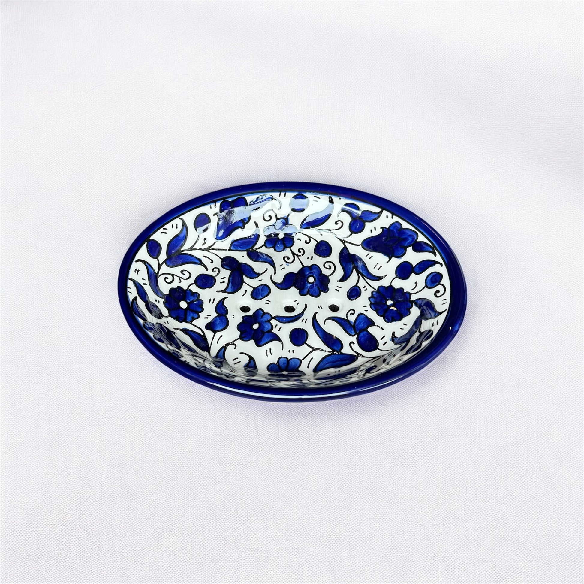 Designed with drainage holes and shaped with function in mind, it adds a subtle touch of Palestinian artistry to your bathroom or kitchen. The floral pattern reflects Hebron's signature heritage designsβtimeless and practical.