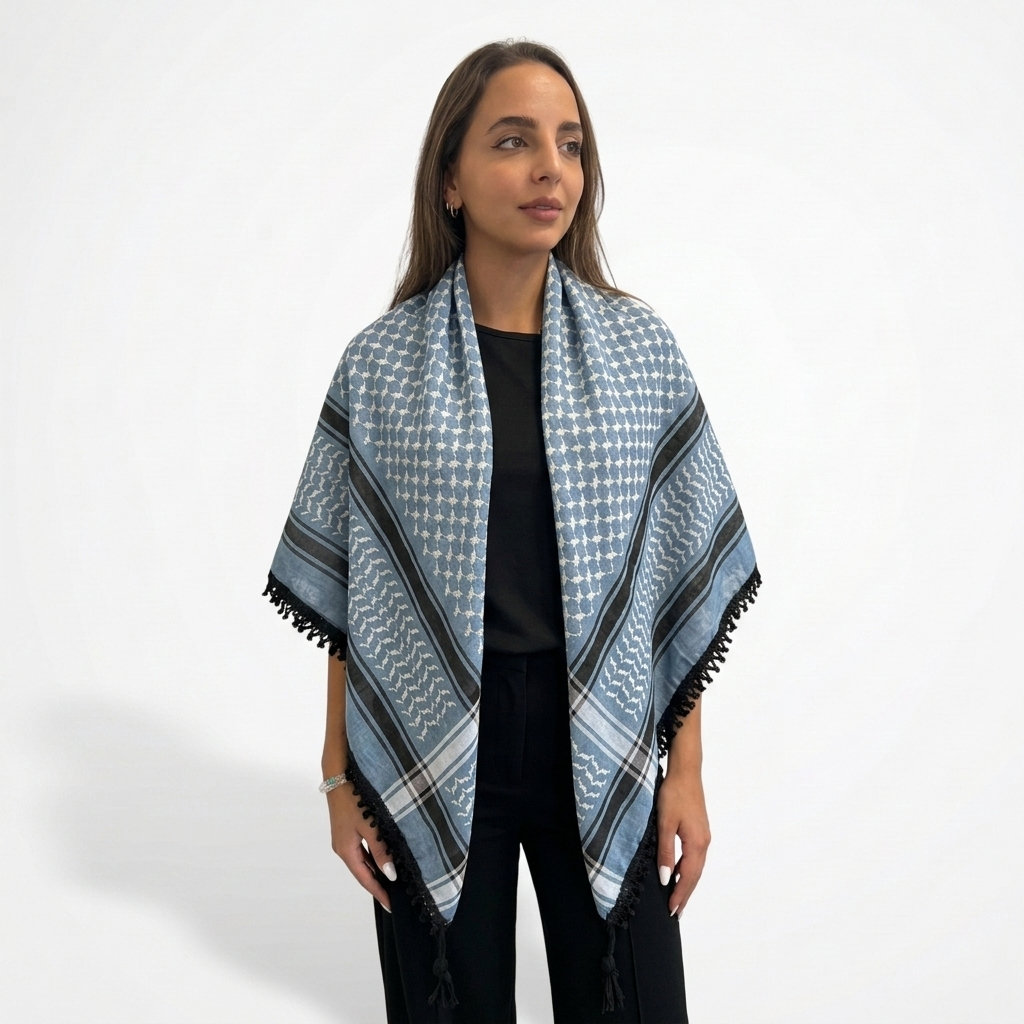 The Echoes Kufiya in Steel Blue (Light) presents this symbolism through a more muted tone and a softened weave. The white-thread pattern blends into the fabric, creating a tonal expression that feels grounded and understated.