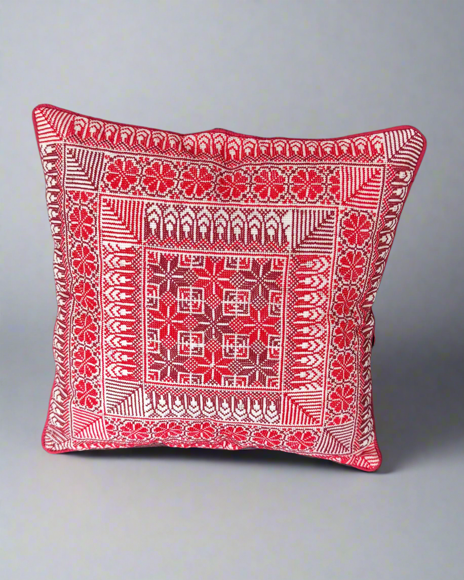 - Size: 16 x 16 in (40 x 40 cm) - Material: Cotton embroidery thread, polyester backing - Enclosure: Hidden zipper for secure fit - Insert not included - Handmade & handstitched in Jordan by Palestinian artisans - One-of-a-kind design