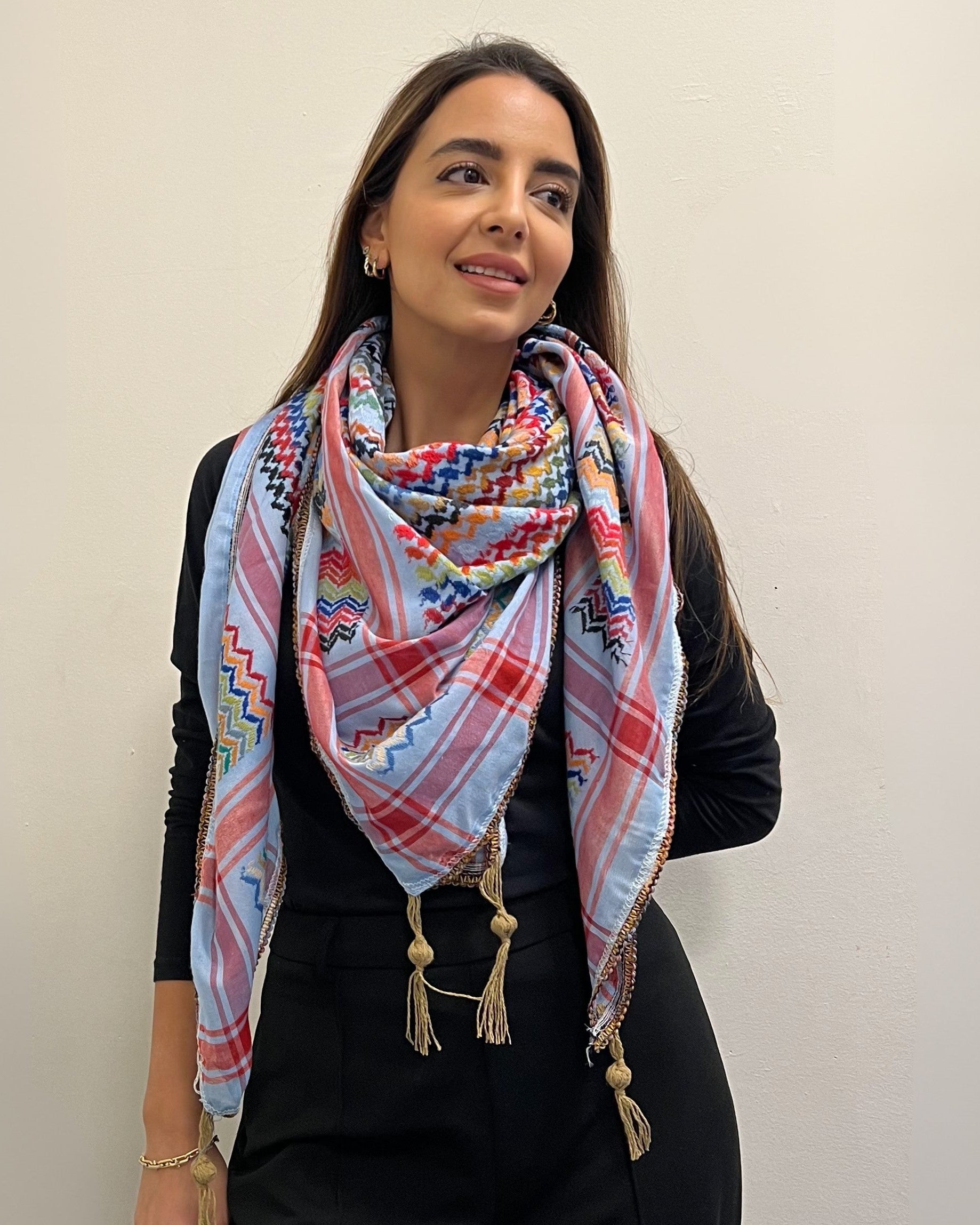 Accented with multicolored threads, it offers a fresh perspective while remaining a powerful emblem of Palestinian identity. Woven by Palestinian artisans in Jordan, it bridges heritage with contemporary style.